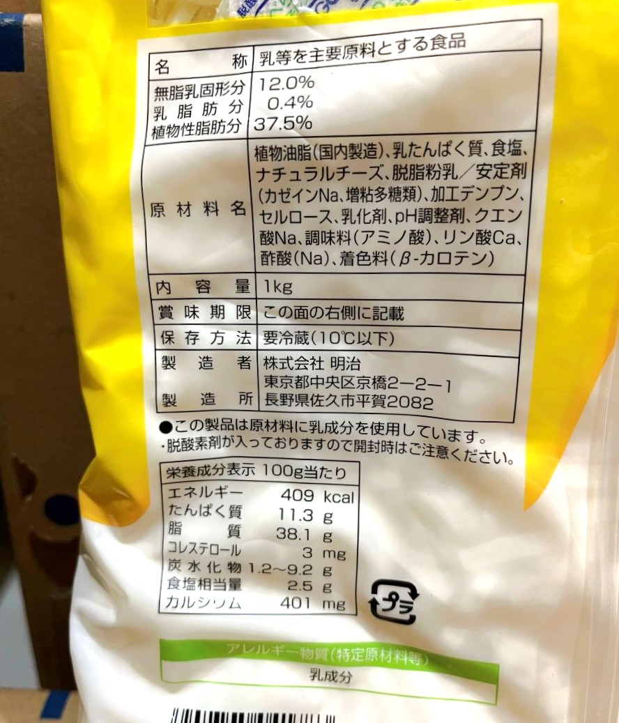 | 原材料名 | 植物油脂(国内製造)、乳たんぱく質、食塩、ナチュラルチーズ、脱脂粉乳 /安定剤(カゼインNa、増粘多糖類)、加工デンプン、セルロース、乳化剤、 pH調整剤、クエン酸Na、調味料(アミノ酸)、リン酸Ca、酢酸(Na)、 着色料(β-カロテン) |