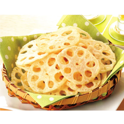 形状よくスライスしたれんこんに、塩味の薄衣をつけた、見ためもきれいな