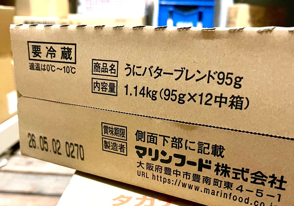 | 原材料名 | 食用植物油脂(国内製造)、食用精製加工油脂、うに調味料粉末(デキストリン、うにペースト調味料、食塩、蛋白加水分解物、酵母エキス、砂糖、発酵調味料)、バター、食塩、砂糖混合ぶどう糖果糖液糖、酵母エキス、ホタテエキスパウダー、カツオエキス/加工デンプン、調味料(アミノ酸等)、乳化剤、着色料(パプリカ色素、カロテン、クチナシ色素)、香料、pH調整剤、(一部に乳成分・大豆を含む) |