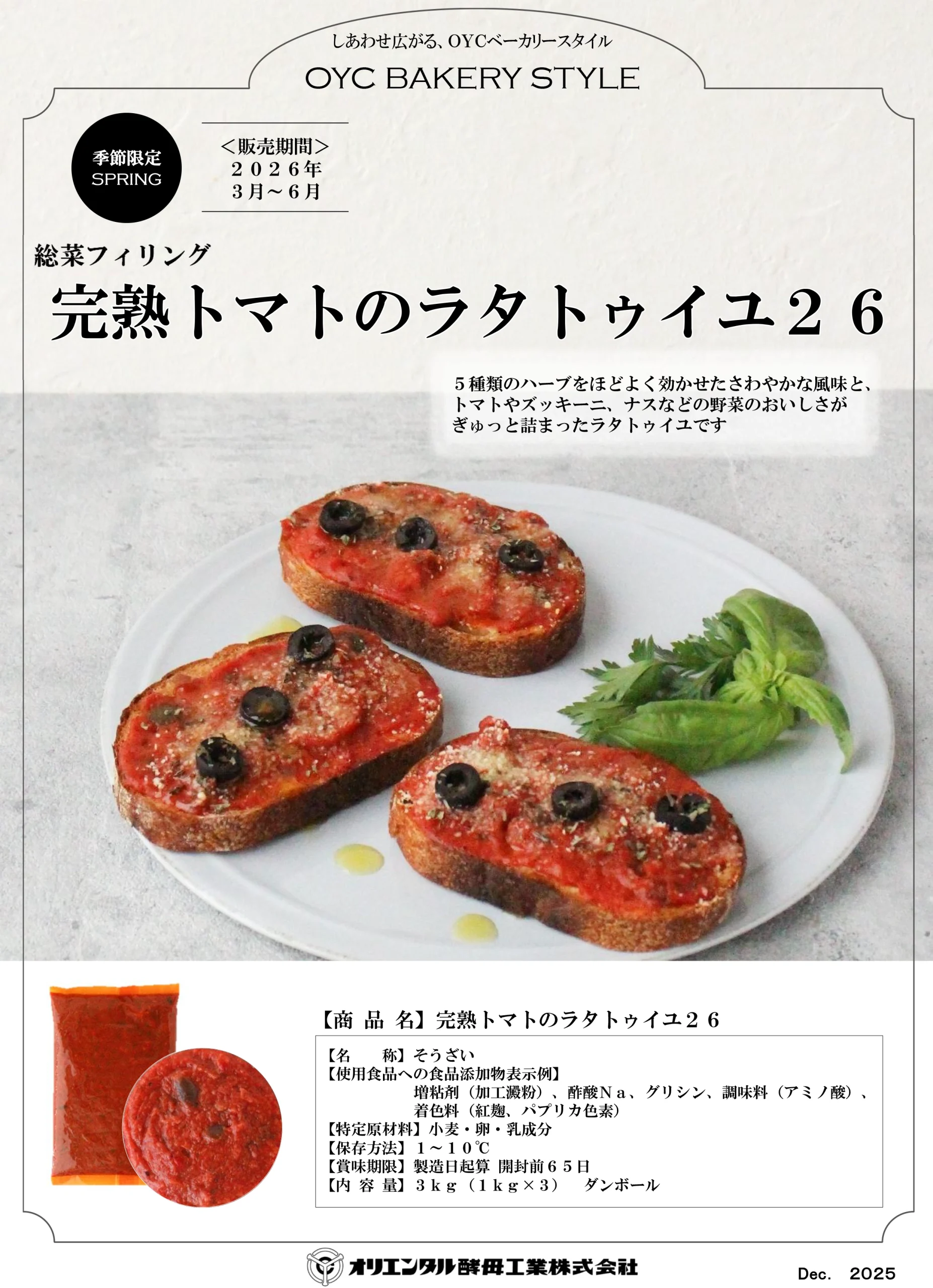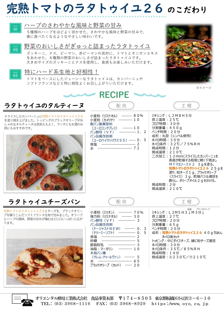 オリエンタル酵母工業「OYC BAKERY STYLE(OYCベーカリースタイル)」の春季限定商品「総菜フィリング 完熟トマトのラタトゥイユ26」の販売を開始いたしました。