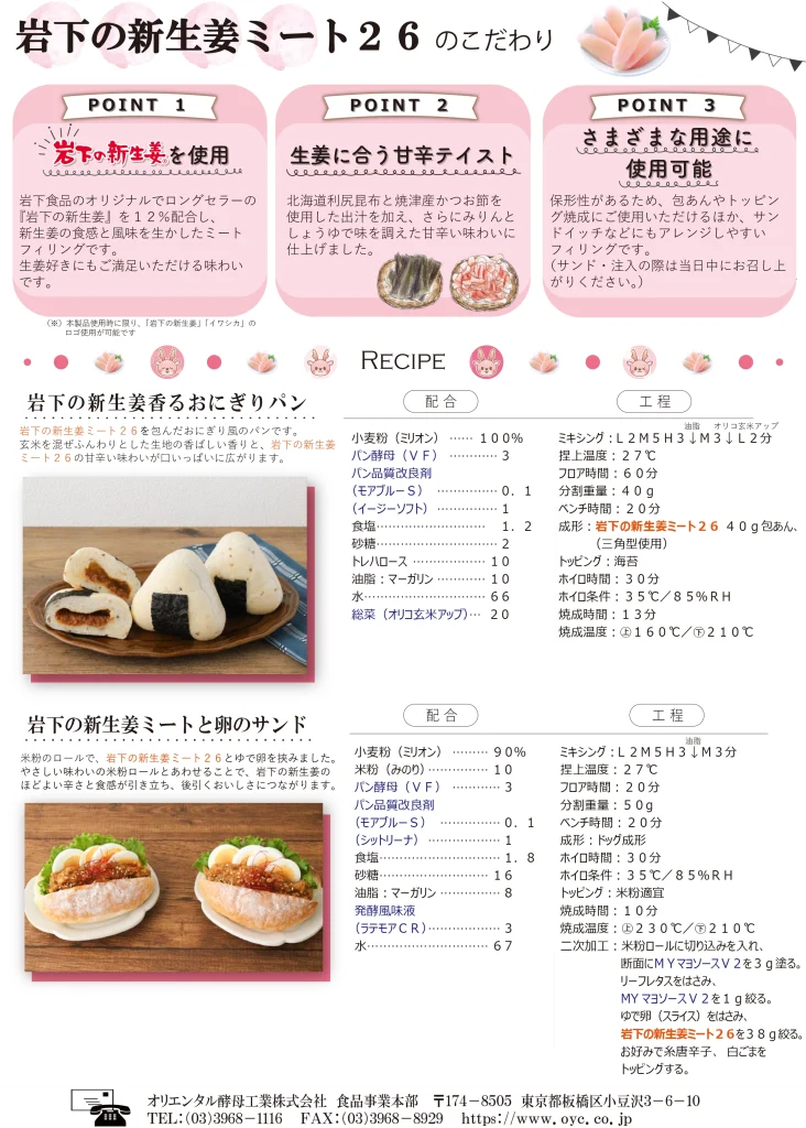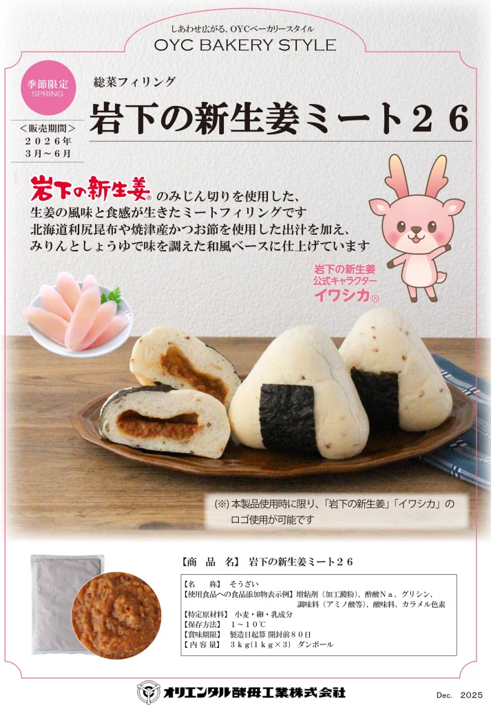 オリエンタル酵母工業「OYC BAKERY STYLE(OYCベーカリースタイル)」の春季限定商品「総菜フィリング 岩下の新生姜ミート26」の販売を開始いたしました。