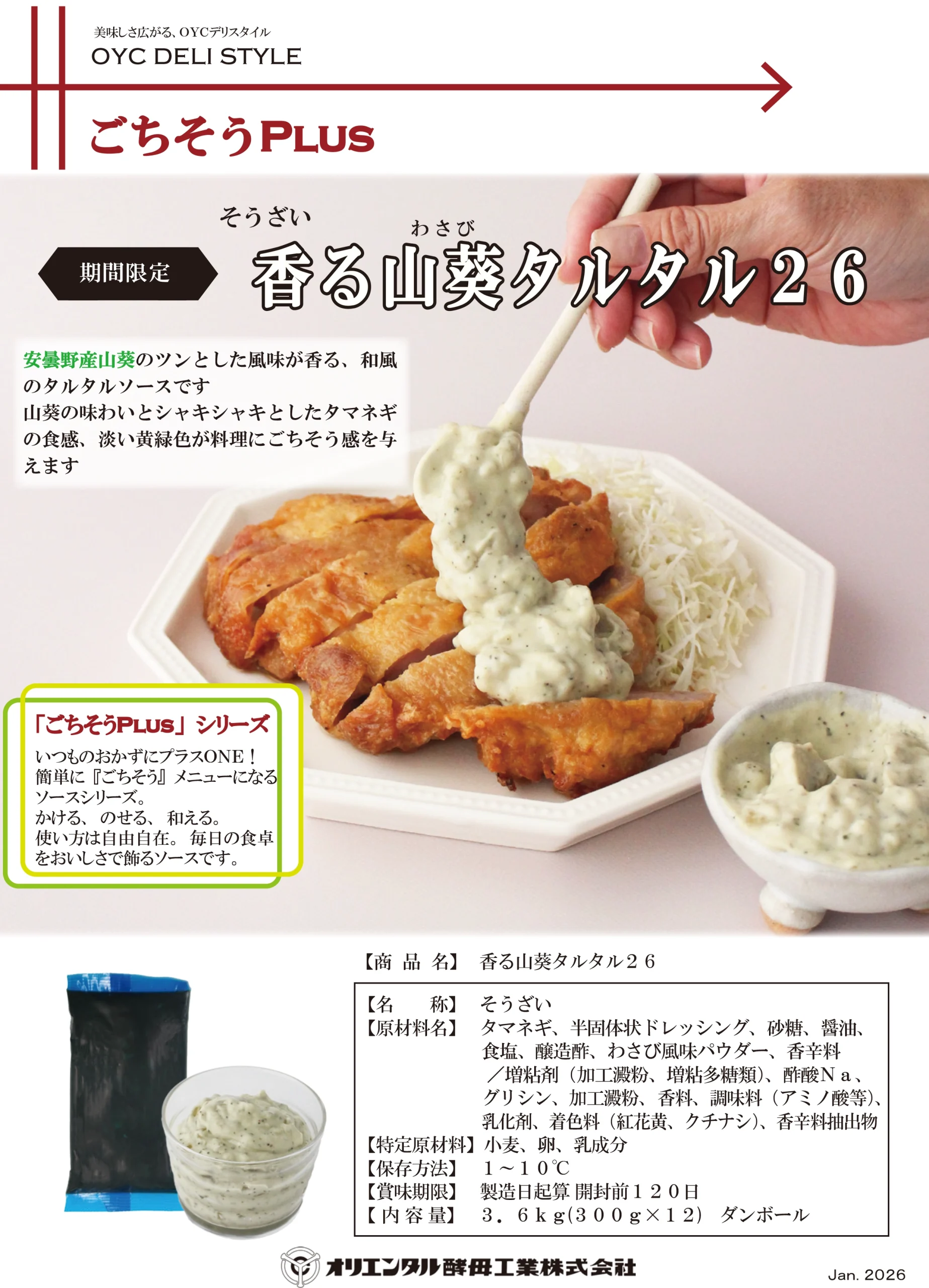 オリエンタル酵母工業「OYC DELI STYLE(OYCデリスタイル)」の期間限定商品「そうざい 香る山葵タルタル26」の販売を開始いたしました。